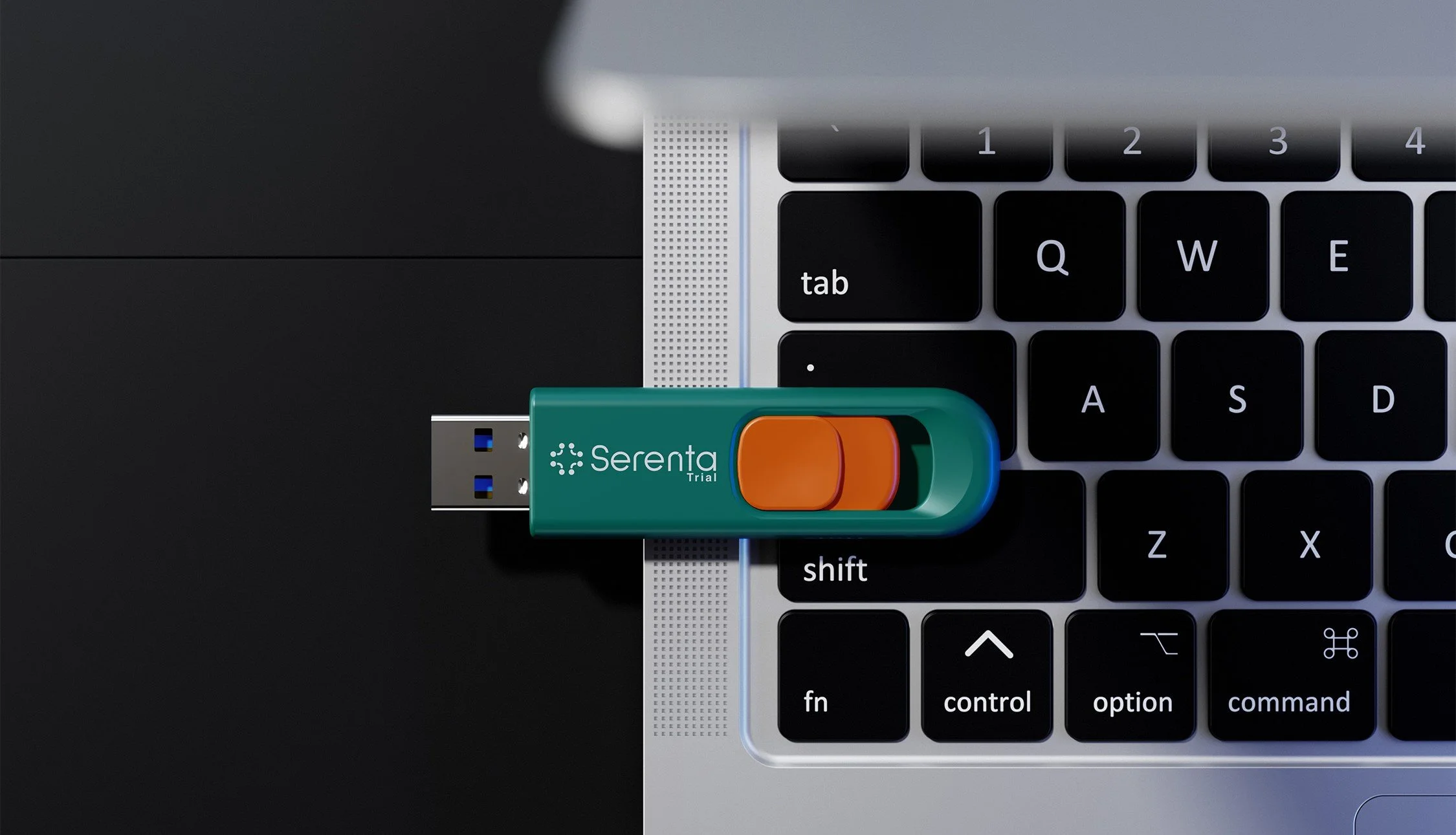 The Serenta logo combines modern, clean typography with an icon inspired by the small polyps commonly associated with familial adenomatous polyposis (FAP). This subtle graphic element is intertwined with a cross, a symbol widely recognized in the healthcare industry, reinforcing the trial's medical focus.